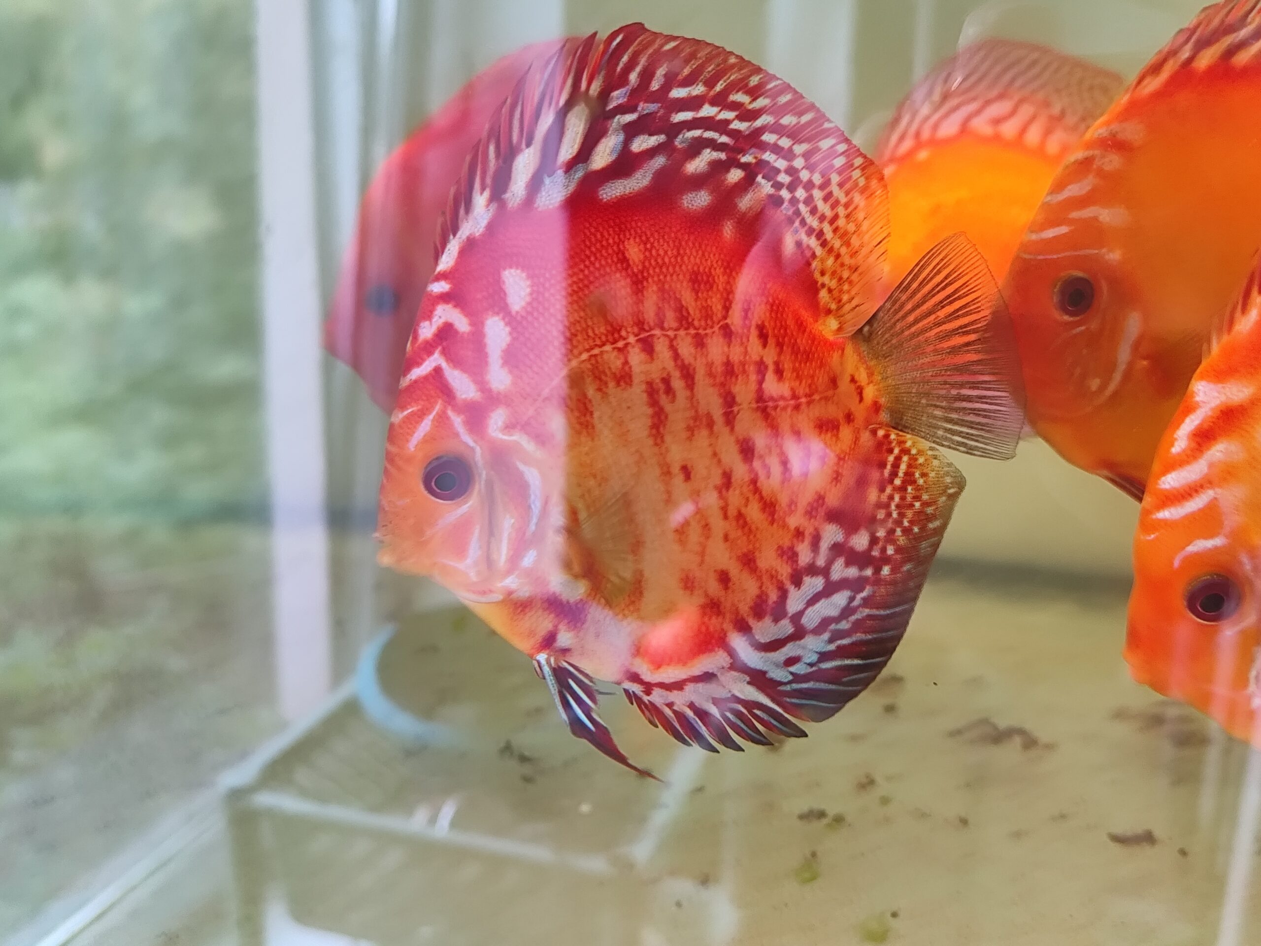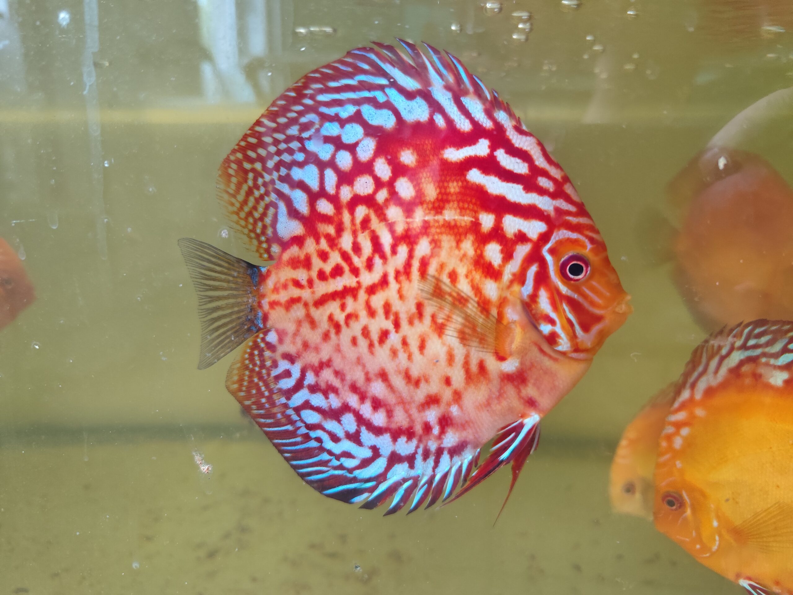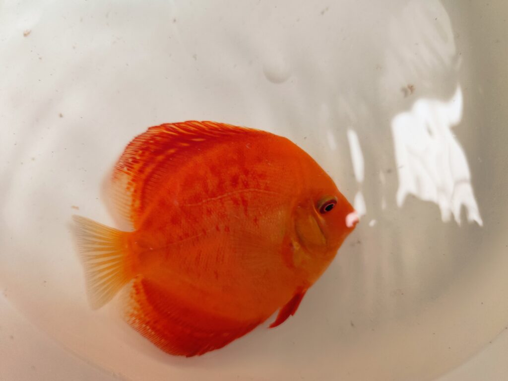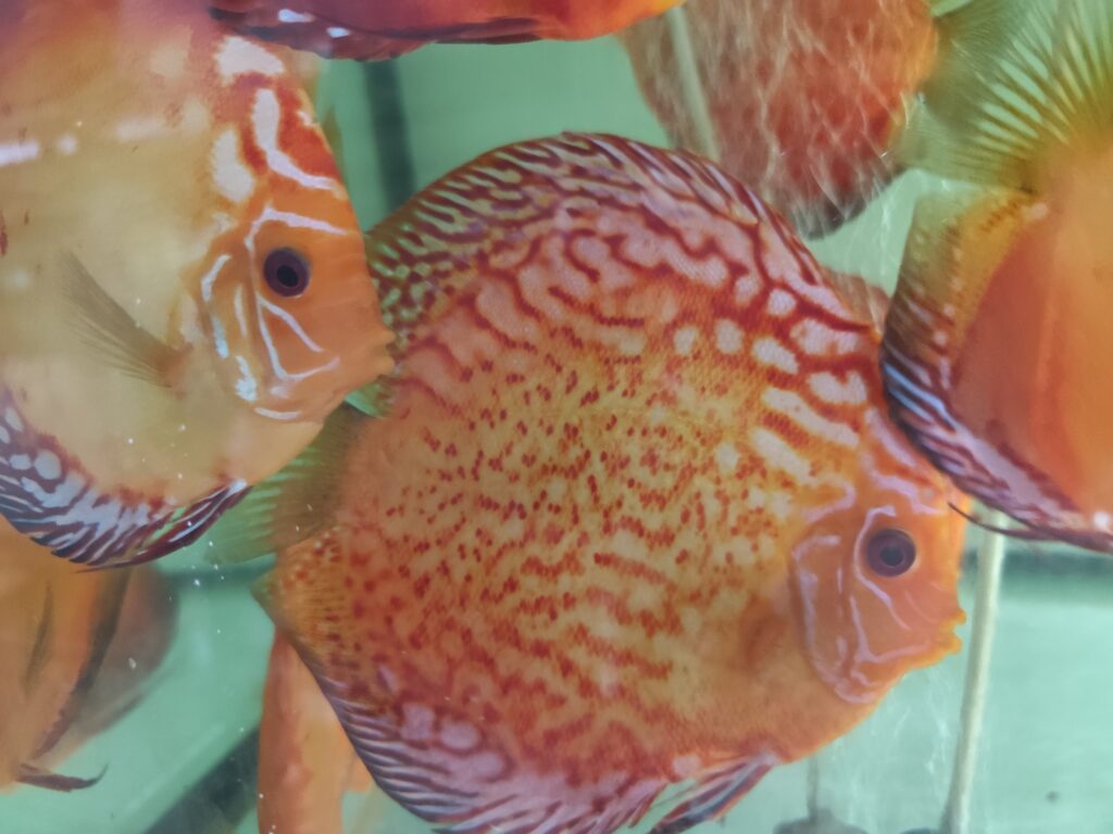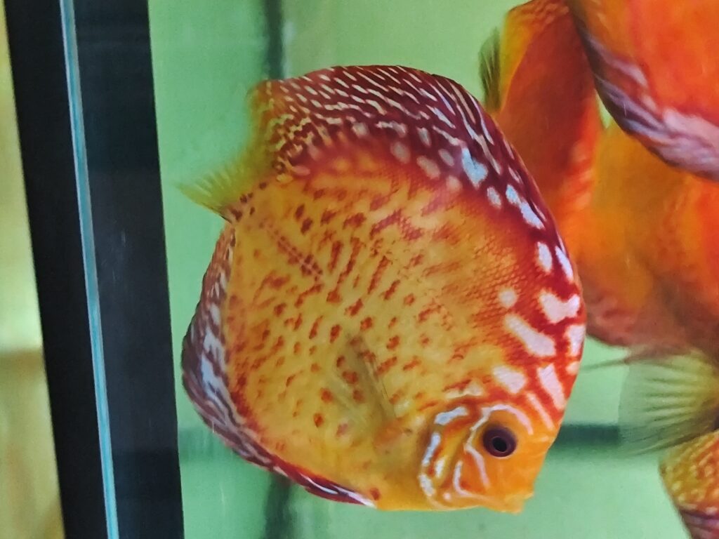 Paletka Red Leopard (Symphysodon sp.) to jedna z najbardziej efektownych odmian barwnych wśród czerwonych dyskowców. Jej nazwa pochodzi od charakterystycznych czerwonych plamek i cętek, które przypominają skórę lamparta. W przeciwieństwie do jednolitych odmian, takich jak Paletka Solid Red, Paletka Red Leopard zachwyca niepowtarzalnym, nieregularnym wzorem i kontrastowym połączeniem barw, dzięki czemu każdy osobnik jest inny i wyjątkowy.